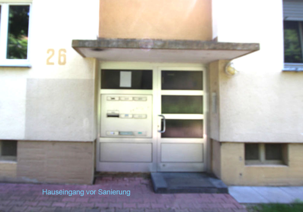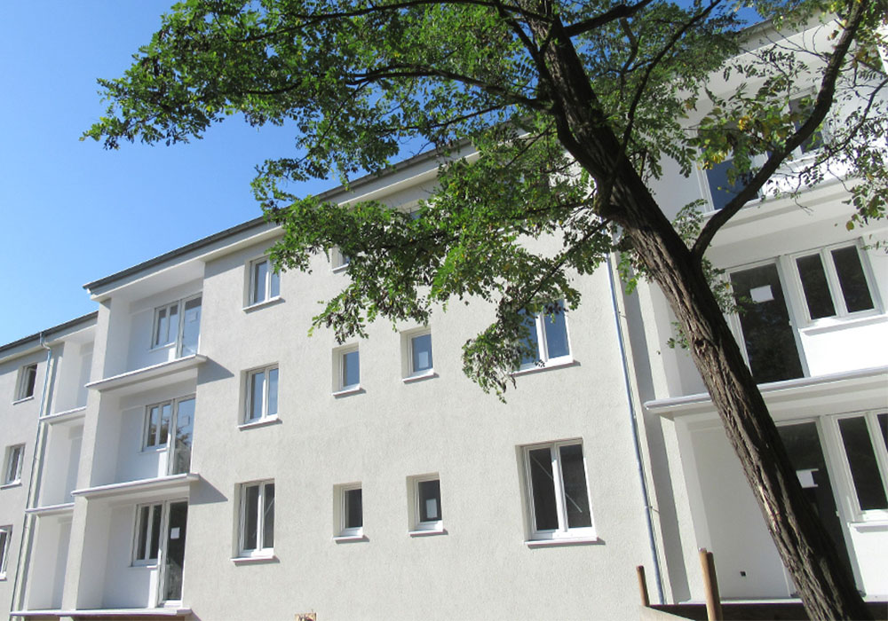 Im Außenbereich erfolgten eine Betonsanierung der Balkone, die Erneuerung der Brüstungselemente, die mineralische Dämmung der Fassade und die Dämmung von Dachboden, Kellerdecke und -außenwand. Die Schornsteinzüge wurden komplett abgebrochen und die fehlende Dacheindeckung ergänzt. Die Fenster wurden ausgetauscht und mit Rollläden versehen.